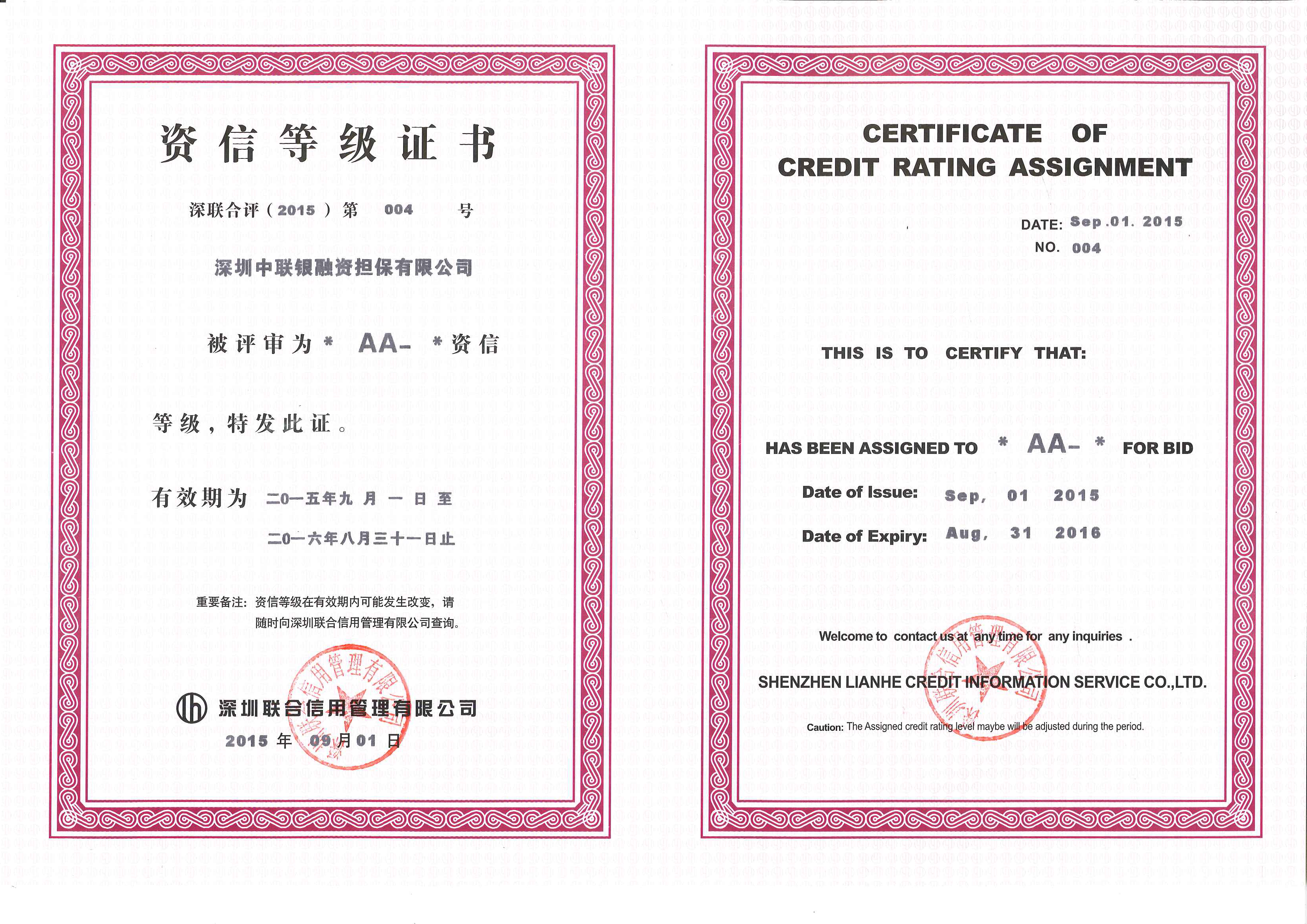 2015年8月,中联银委托深圳联合信用管理有限公司(简称深联信评)从经营环境、营运风险、担保风险、资金风险、资本充足性等方面对中联银资信状况进行综合分析和评估。经深联信评审定,中联银的信用等级从 “A+” 升级为 “AA-”。