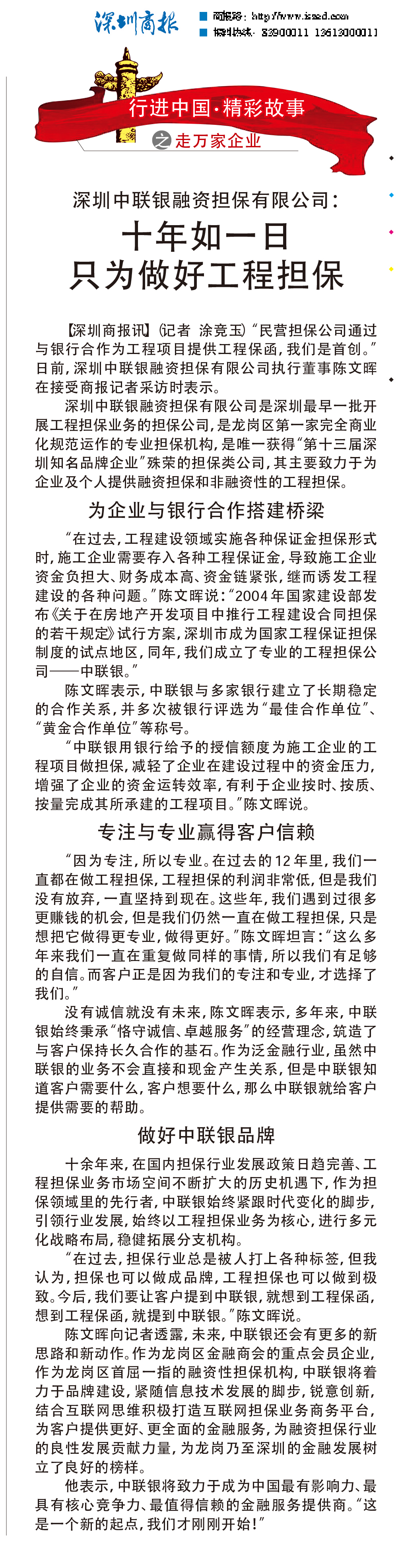 2016年7月,yl23411永利董事长陈文暉接受深圳商报记者专访,总结中联银作为深圳知名品牌,十余年“恪守诚信、卓越服务、锐意创新、稳健发展”,诚挚为工程建设领域建筑企业提供工程保函服务的信念和坚持。