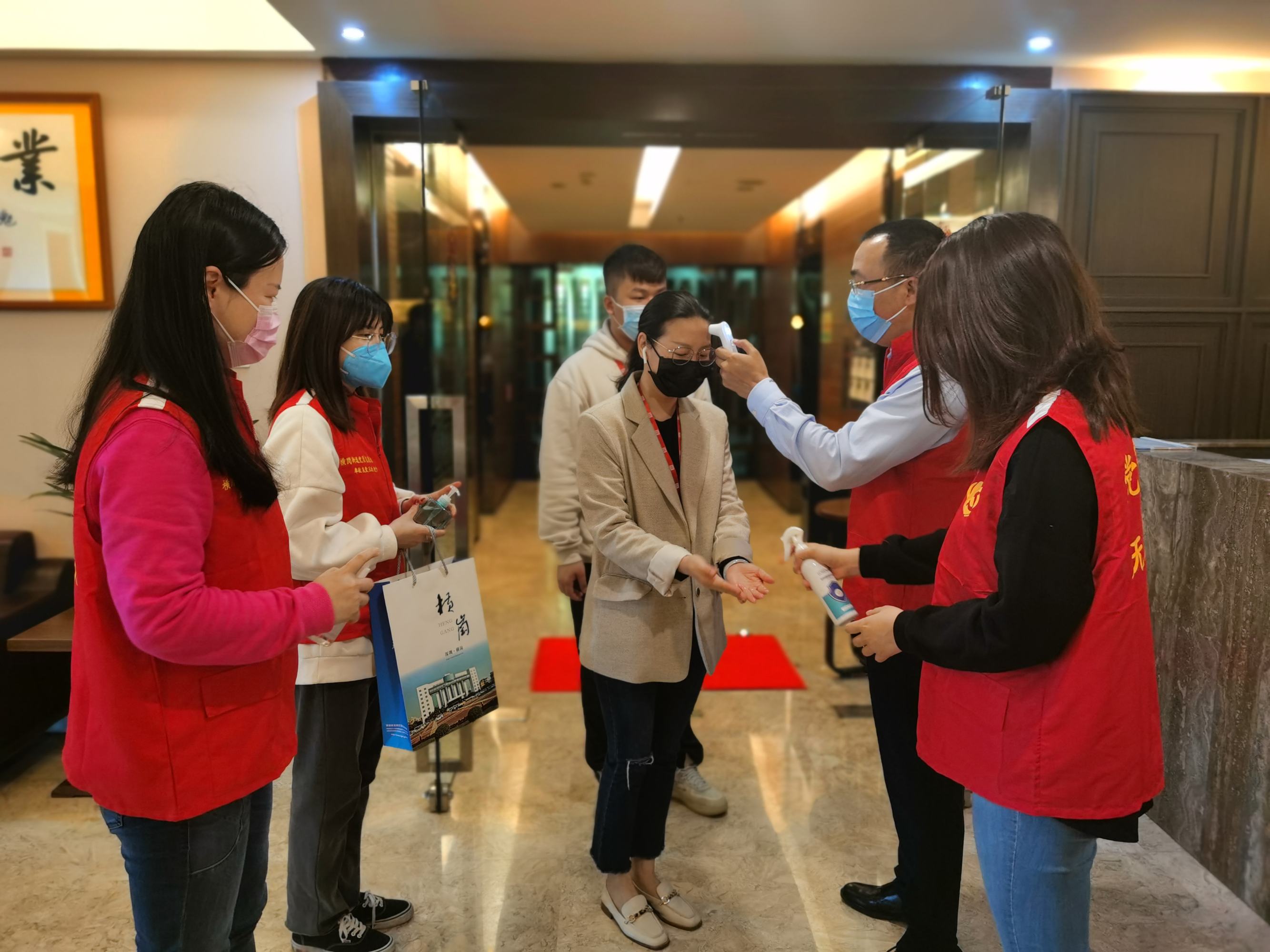 中联银新冠状病毒肺炎防控工作领导小组,为值班的小伙伴测量体温,并做好进办公区域消毒工作。