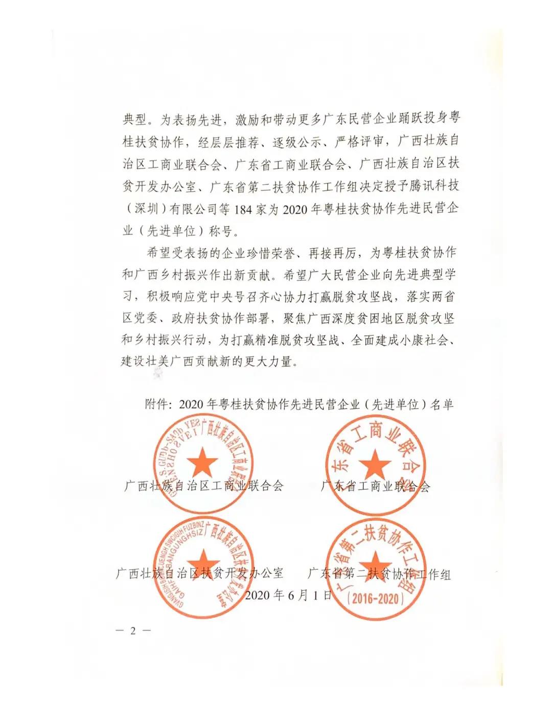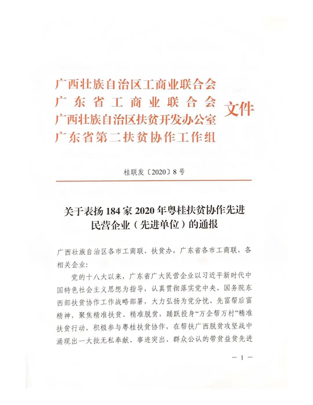 今年六月初,广西壮族自治区工商联、扶贫办、广东省工商联、广东省第二扶贫协作工作组,在南宁市联合举办2020年粤桂民营企业助力国家挂牌督战村暨产业扶贫协作活动,推动粤桂民营企业扶贫协作提质增效,助力广西脱贫攻坚。yl23411永利等184家民营企业被授予“粤桂扶贫协作先进民营企业”称号。