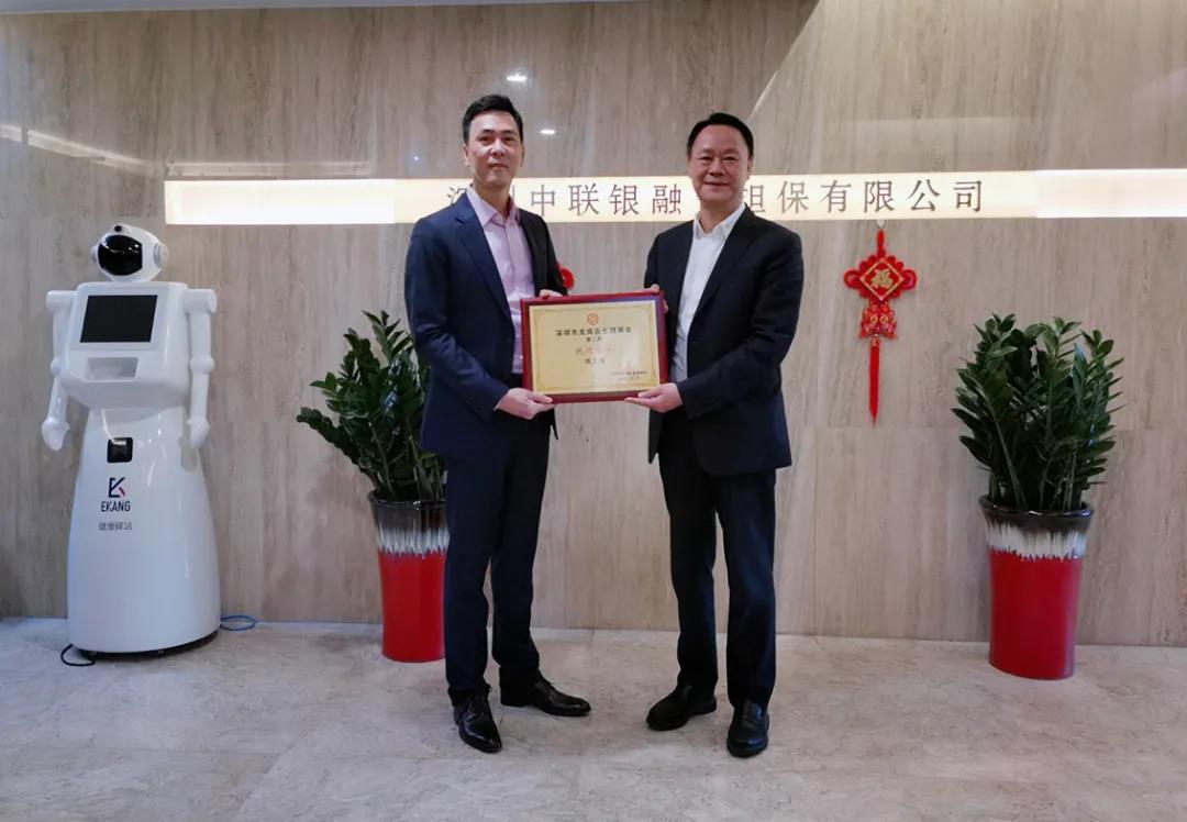 区金融商会黄时余会长向中联银董事长陈文晖颁发任职牌并表示热烈的祝贺。2021年龙岗区金融商会第二届理事会换届在即,近期召开的常务理事会议中大家一致推荐陈文晖先生为第三届理事会会长候选人,同时决定该商会更名为“深圳市龙岗区金融科技商会”。他还表示,陈文晖会长的任命为区金融商会注入新动力,一系列为会员服务的新想法、新思路让人为之一振,特别是为龙岗区科技类行业更好的发展带来福音,通过规范的金融手段、优质的金融服务,为辖区科技行业健康发展保驾护航。相信在政府和各位会员的大力支持下,区金融商会必将在新一轮改革发展的征程中发挥更大作用,做出更大贡献,赢得更多荣誉。