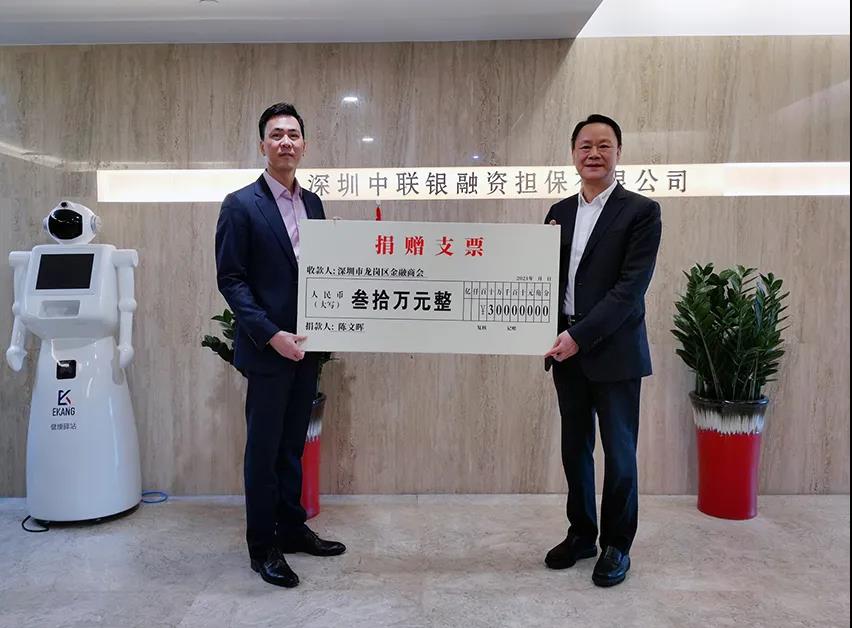 为支持区金融商会更好的发展、壮大,陈文晖董事长特向区金融商会捐赠30万元,并对黄时余会长及全体会员的信任、支持表示感谢,区金融商会在黄时余会长的带领下获得“全国工商联《中华工商时报》工商联工作十大创新评选优秀案例”、广东省4A级社会组织等荣誉,今后将延续“金融共享,价值共创”的办会核心宗旨和发展目标,发扬区金融商会的优良传统,定当不负重托,砥砺前行,为会员服务,为社会贡献,为商会添彩!