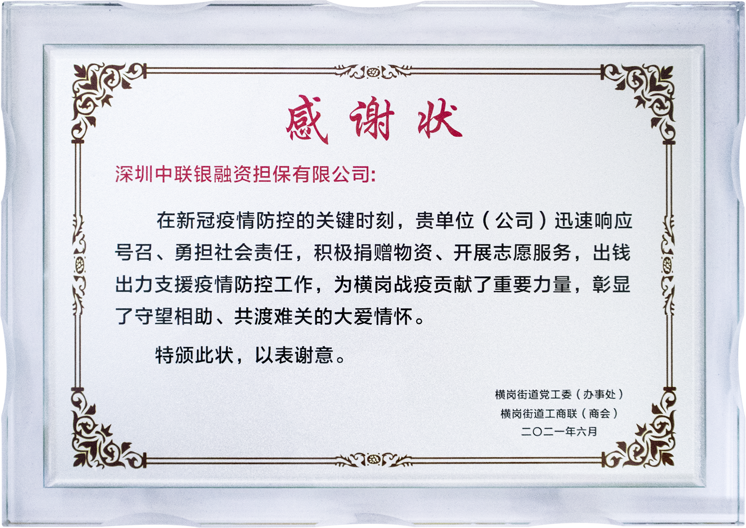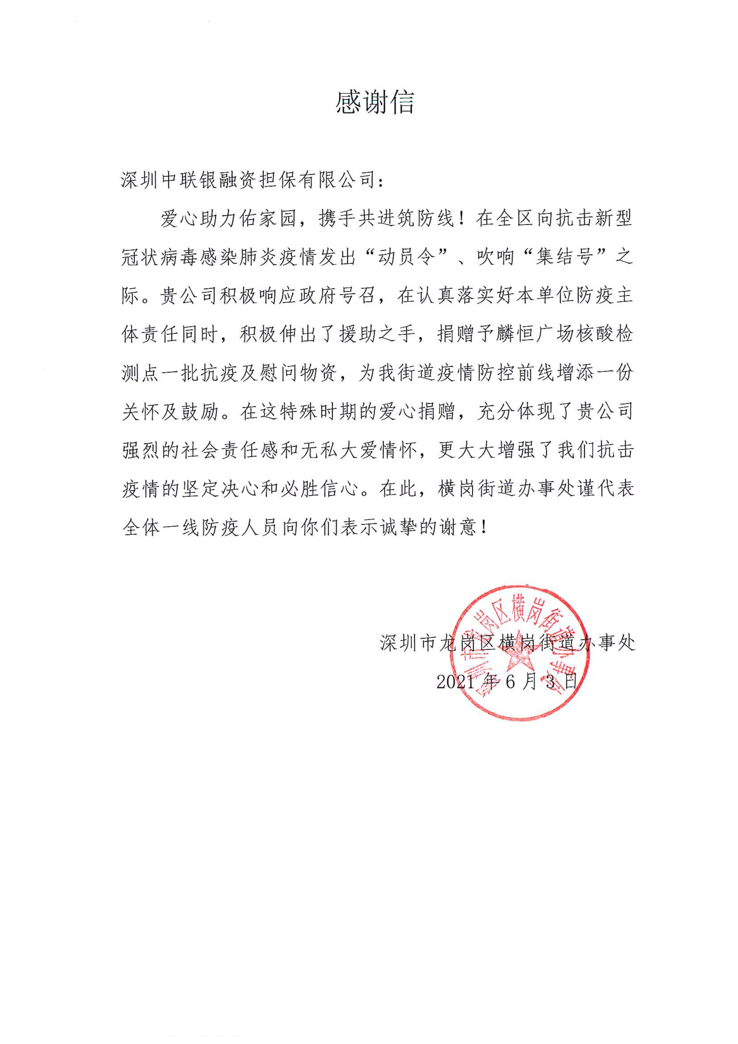 捐赠中,横岗街道办及社区对中联银作为表示赞扬及感谢:“疫情复发突然,社区各抗疫工作站处于紧张状态,中联银此次捐赠活动大大缓解工作人员炎热的情况,也希望所有工作人员注意自身防护。”事后,横岗街道工商联发来感谢状,横岗街道办事处也发来感谢信,再次表达感激之情。