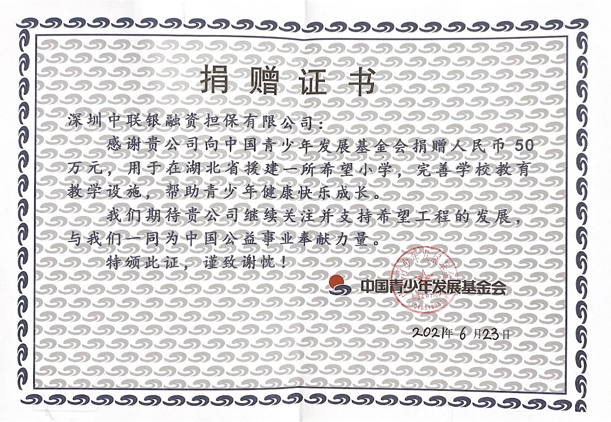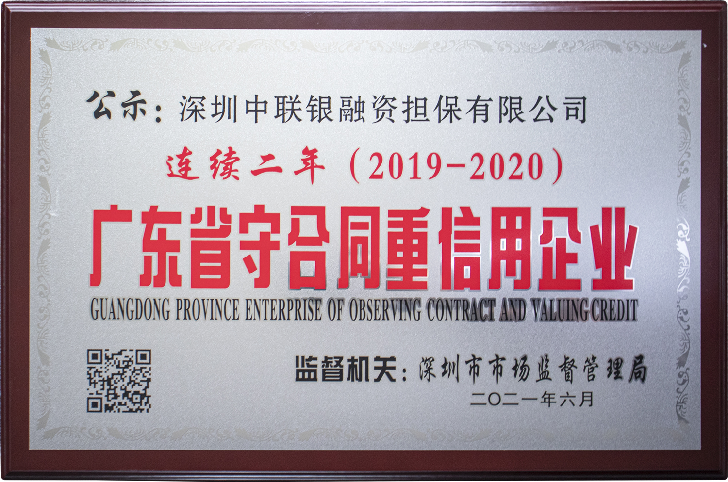 此外,在今年6月,广东省市场监督管理局公布了2020年度广东省“守合同重信用”企业名单,中联银融资担保有限公司凭借良好的社会信誉和规范的合同管理体制,连续两年荣获“广东省守合同重信用企业”称号。