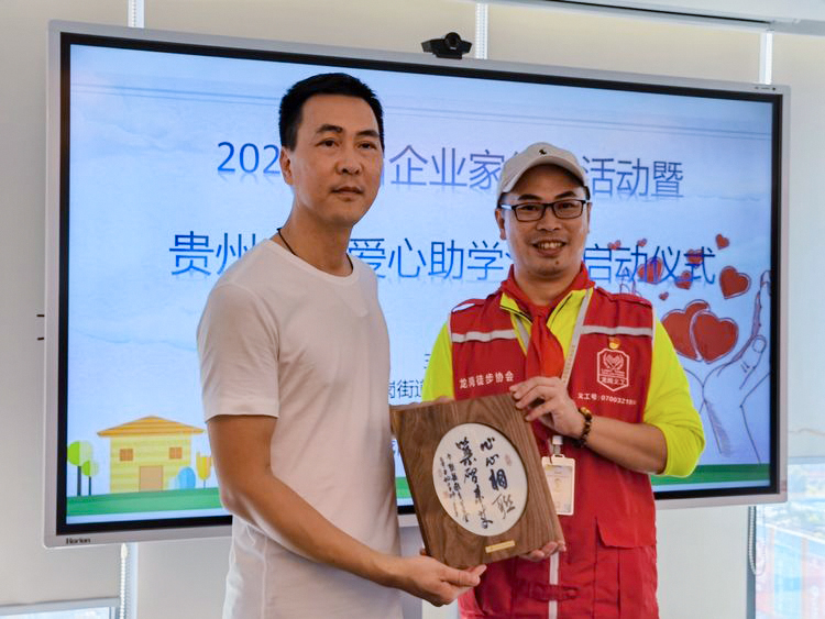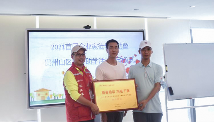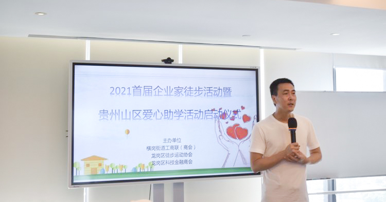 徒步活动结束后,企业家们参与了贵州山区爱心助学活动启动仪式。区徒步协会会长林汉伟简要介绍协会概况,重点介绍了贵州助学项目和成果,通过"走进大山"活动,让社会了解阿依小学,呼吁更多的人参与到助学行动中来。