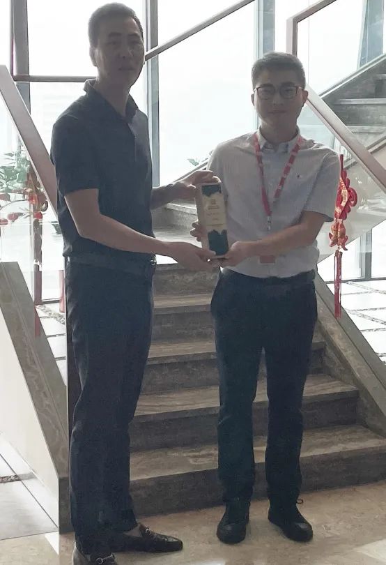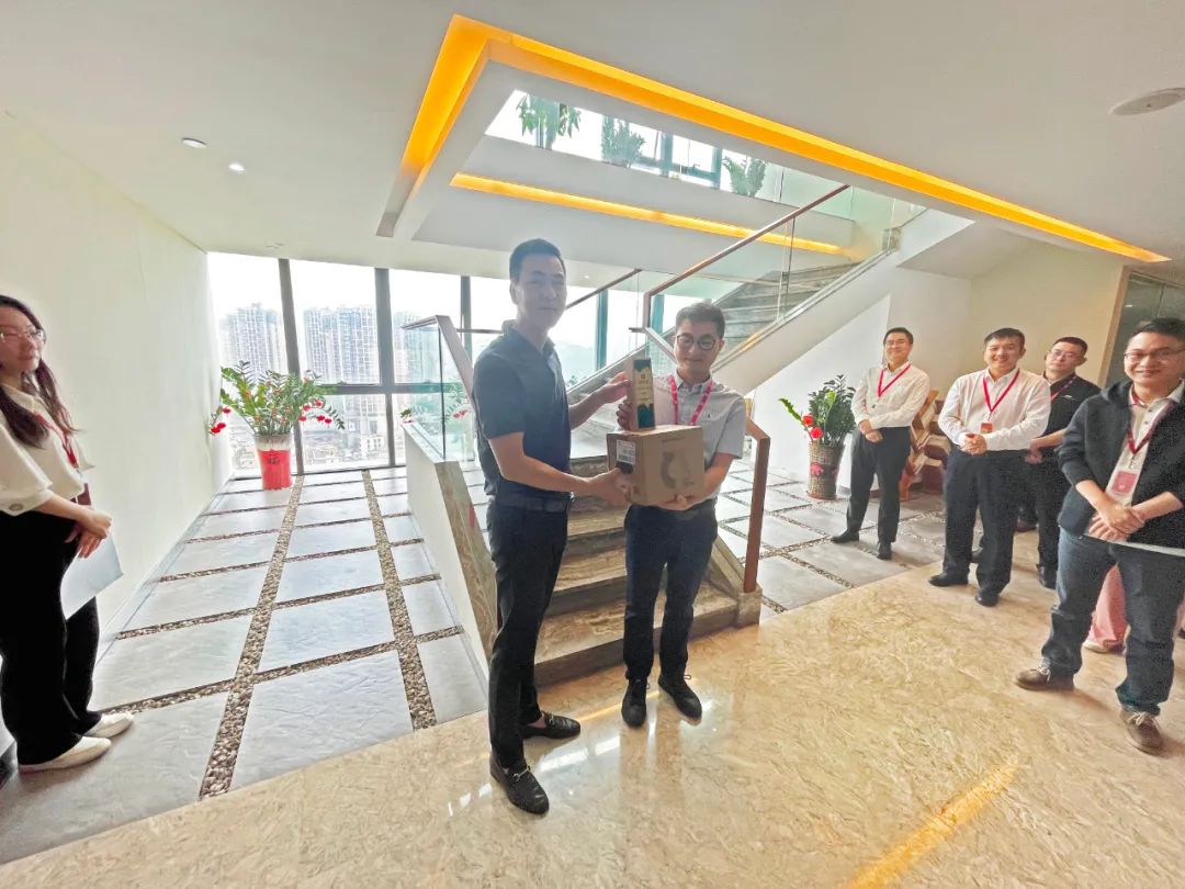 陈文晖董事长百忙之中抽空参与本周晨会,亲手为马乐同事颁发了分享之星奖杯与电热养生壶奖品,对马乐同事表示祝贺,也对他分享的晨会内容表示认可。