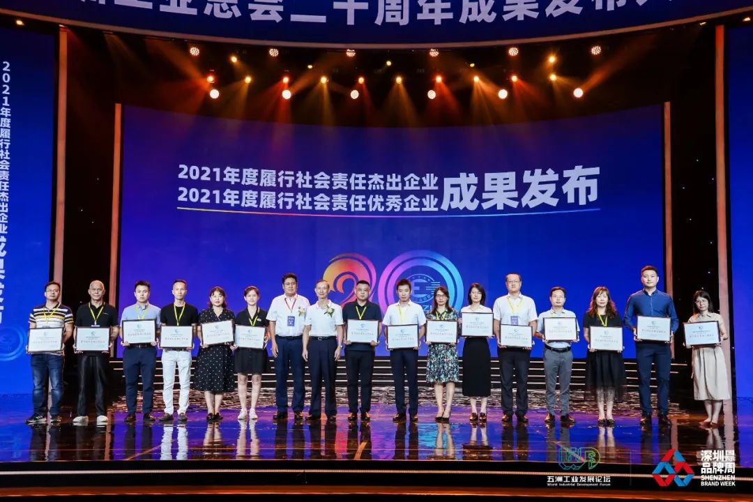 我司在“深圳工业总会二十周年成果发布大会”上荣获“2021年度履行社会责任优秀企业”荣誉,并获得工业总会颁发“深圳工业总会创立20周年贡献奖”。