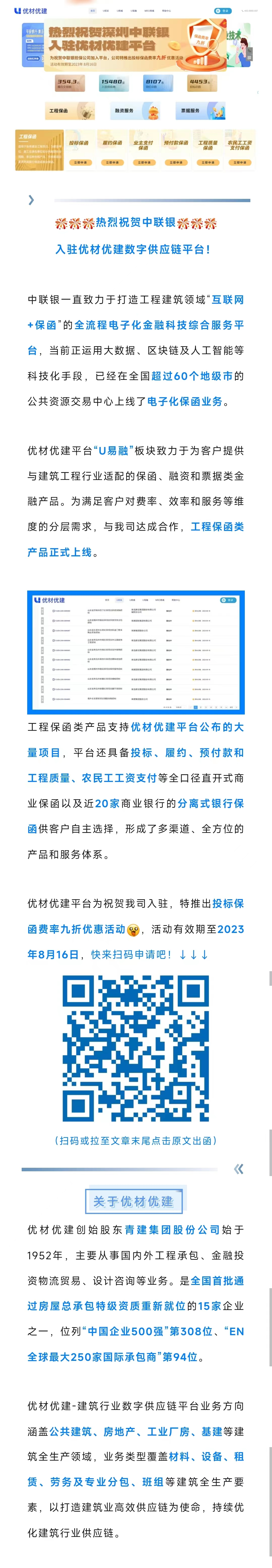 热烈祝贺中联银入驻优材优建数字供应链平台!