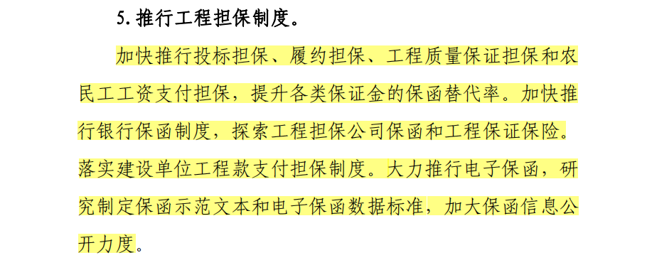 1月25日,住建局关于印发《“十四五”建筑业发展规划的通知》,发文内第三项第二条第5点明确指出:加快推行投标担保、履约担保、工程质量保证担保和农民工工资支付担保,提升各类保证金的保函替代率。加快推行银行保函制度,探索工程担保公司保函和工程保证保险。落实建设单位工程款支付担保制度。大力推行电子保函,研究制定保函示范文本和电子保函数据标准,加大保函信息公开力度。