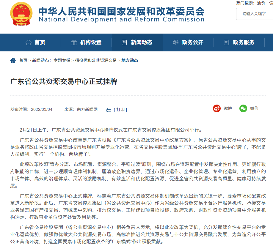 广东省公共资源交易中心正式挂牌,标志着广东省公共资源交易体制机制改革迈出新的关键一步,要素市场化配置改革进入新阶段。此后,广东省交易控股集团(省公共资源交易中心)作为省级公共资源交易平台运行服务机构,承接交易业务涵盖国有产权交易、药械集中采购、排污权交易、工程建设项目招投标、政府采购、财政性资金资助项目中介服务机构选定、行政事业单位资产处置及租赁等。