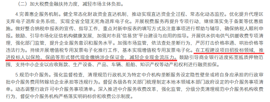 4.完善惠企服务机制。健全常态化财政资金直达机制,推动实现直达资金全过程、常态化动态监控。优化提升代理区支库电子退库业务系统,实现全省全辖无死角退库电子化。开展税费服务再提升专项行动,继续落实免于备案等优惠措施。做好整合纳税申报表的宣传、指导工作,重点对新申报表的填写方式及注意事项进行帮助与辅导,确保纳税人顺利申报。鼓励、引导市场化征信机构健康发展,加强对市县“信易贷”平台建设与应用的指导。开展供水供电供气供暖收费专项清理,强化部门监管,提升企业服务意识和服务水平。加强市场监管,依法查处垄断行为,严厉打击价格串通、哄抬价格等违法行为。持续开展增值税专用发票电子化推行工作,基本实现增值税专用发票电子化。在工程建设项目招投标领域,推进投标人以保险、保函等形式替代现金缴纳涉企保证金,减轻企业现金流压力。鼓励引导商业银行适度拓宽抵质押物范围,支持中小企业以应收账款、生产设备、产品、车辆、船舶、知识产权等动产和权利进行融资担保。
