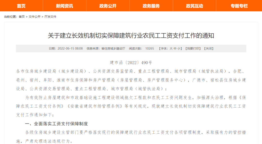 安徽省住房和城乡建设厅发布“关于建立长效机制切实保障建筑行业农民工工资支付工作的通知”,其中第一条第五点: