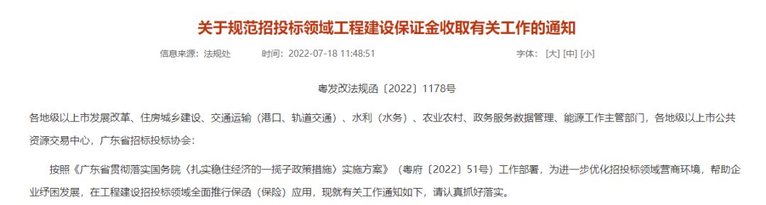 近日,广东发改委、广东住建局等7部门联合发布《关于规范招投标领域工程建设保证金收取有关工作的通知》(粤发改法规函〔2022〕1178号):
