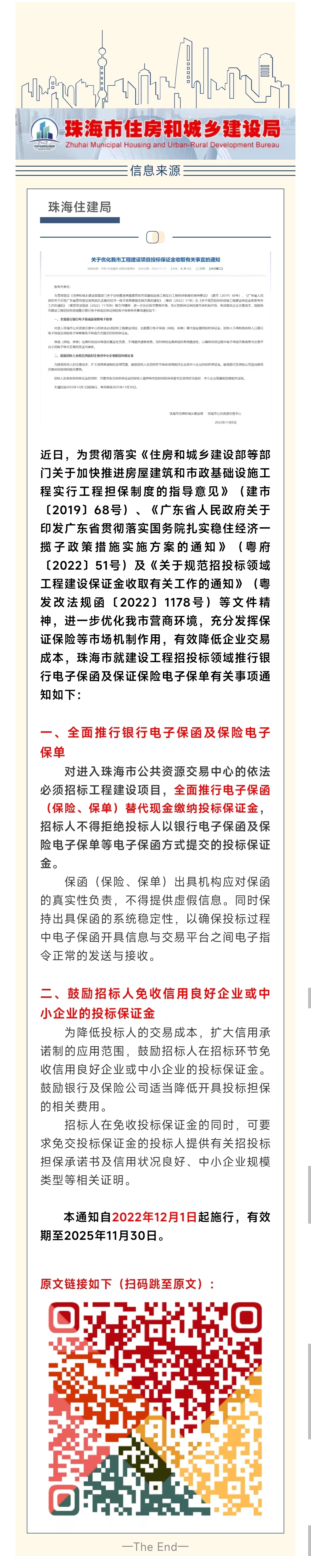 珠海住建局丨2022年12月1日起珠海工程建设招投标将进入电子保函时代